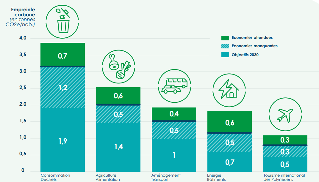 Tel qui qu'il a été approuvé, le plan d'action permet d'arriver à 8,5t de CO2e/hab/an en 2030, par rapport aux 5,5 fixés dans la stratégie. Tous les secteurs d’activités planifient une baisse de leur empreinte carbone mais de manière insuffisante comme détaillé dans le graphique ci-dessous :
